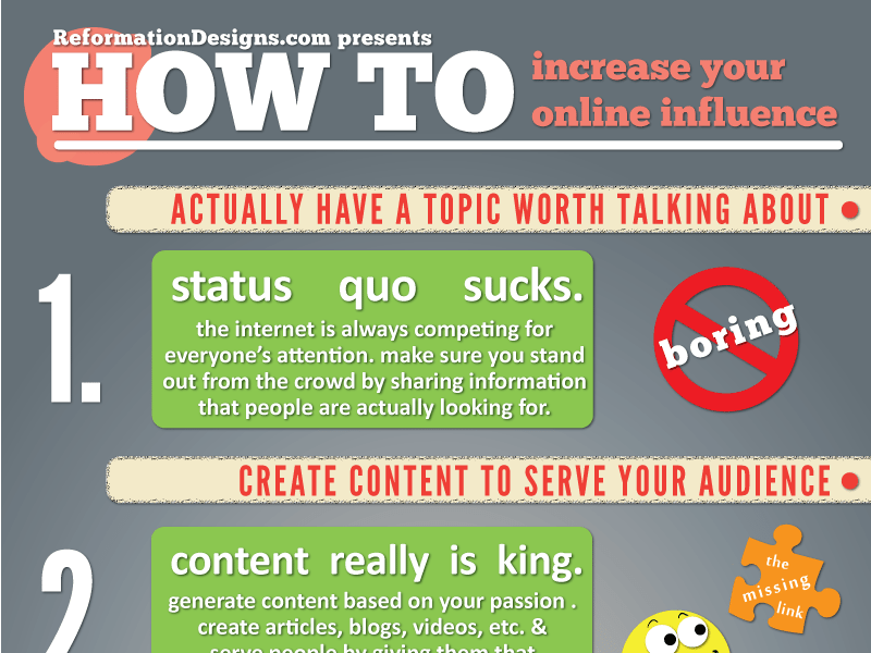 Whether you know it or not, your church has an online influence. How you communicate with the world through digital means has a huge affect on members, visitors, and the community. Below is a helpful infographic that breaks down online influence in five relatively simple steps. Like anything, approach and attitude is 95% of the game. I hope these tips below help you increase and enhance your approach to church online influence: